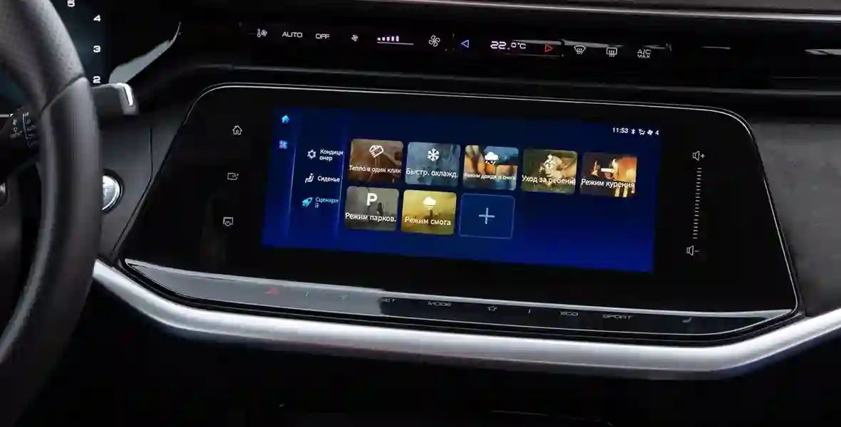 Двухспицевый руль — без сенсоров, вместо них — привычные блоки кнопок. Несколько старомодные внешне, но от этого не менее удобные. Совсем без тач-панелей Shine Max не оставили: сенсоры собраны под центральным дисплеем и над ним, где располагается блок, отвечающий за основные настройки климат-контроля. Причём они слушаются даже пальцев в тонких перчатках! Жаль только, что среди них нет управления подогревами сидений: за этим приходится «проваливаться» в меню мультимедийки.