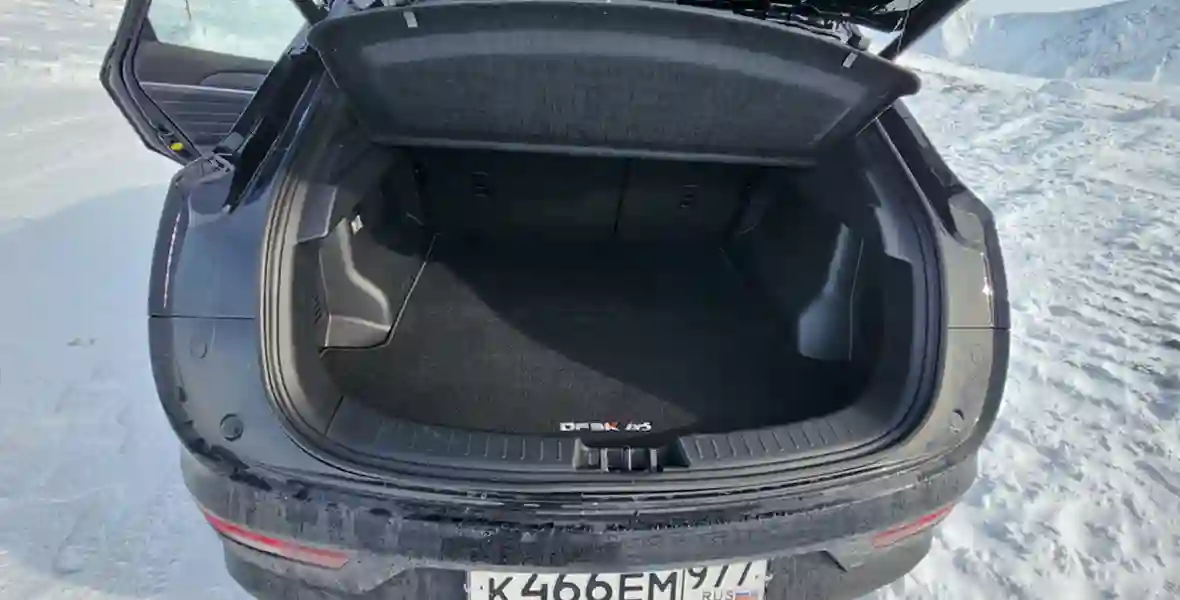 Несмотря на такой крупный багажник, задний ряд получился на удивление просторным. Колесная база у DFSK ix5 всего на два сантиметра меньше, чем у 7-местного ix7 (2790 мм против 2810 мм). Поэтому наличие жестких пластиковых накладок на спинках передних кресел никак не смущает. Свободного пространства перед коленями при посадке «сам за собой» (рост 186 см) остается много. Пол ровный, места для ступней даже в крупной зимней обуви остается с запасом. Над головой тоже свободно. Из дополнительных удобств: один разъем USB-A, розетка на 12V, ниша для телефона и раздельные дефлекторы вентиляции.